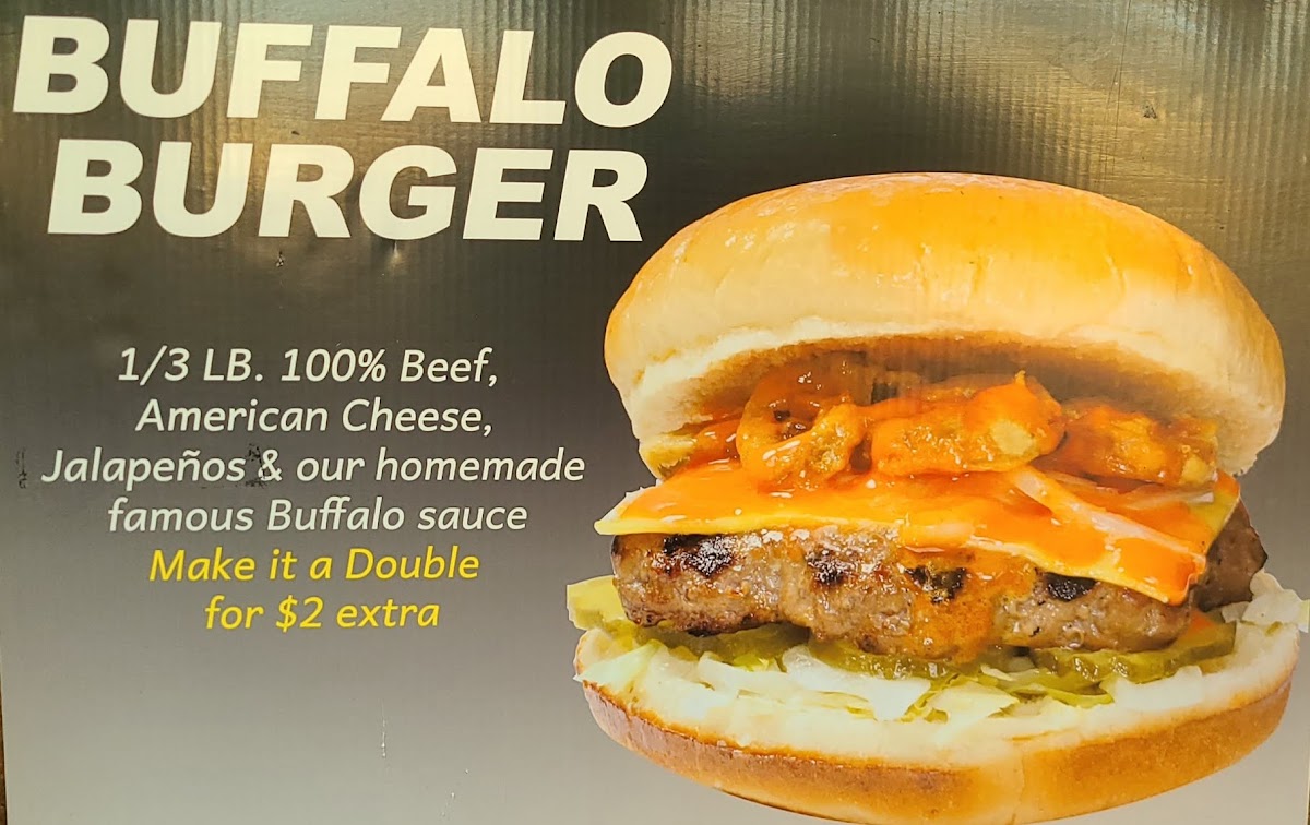 With lettuce pickles fried onions ketchup mustard are homemade buffalo sauce and American cheese
